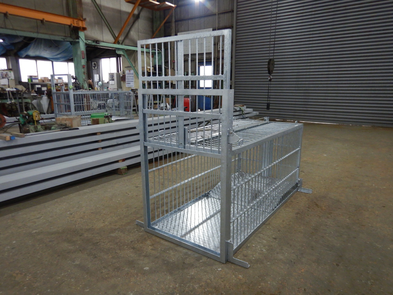 有害鳥獣捕獲用箱わなです。秋田県ならびに秋田市などの行政からの依頼で20年ほど前から製作しており、30基ほどの納入実績があります。溶融亜鉛メッキ仕上げで錆に強く、使用後の洗浄も楽です。